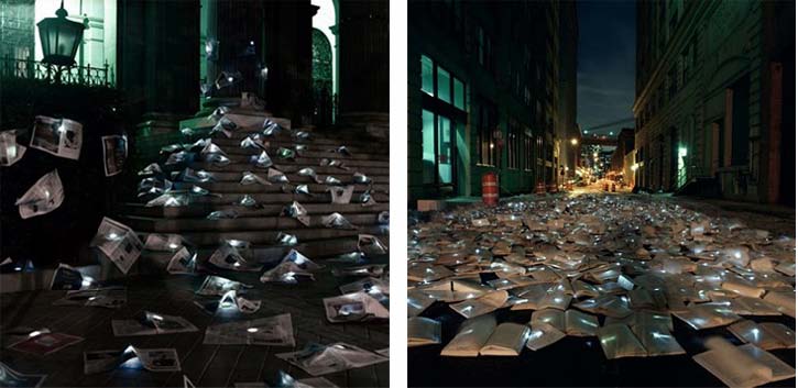 Otra vez anochece. Las escalinatas del edificio de la Bolsa, que alberga Junta General de Accionistas en unas horas, se tapizan con páginas luminosas de periódicos de noticias económicas…. Es la crisis, la crónica de una crisis anunciada… Pero ‘Luzinterruptus’ no anuncia su próxima intervención. Ni cuándo, ni dónde. Eso solo aparecerá en su web un día después.